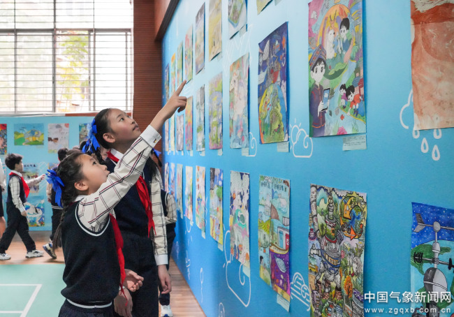 3月20日,广西壮族自治区气象服务中心、南宁市气象局、南宁市滨湖路小学携手举办主题科普活动。图为学生驻足欣赏书画作品展图/文 谭容梅 施萁